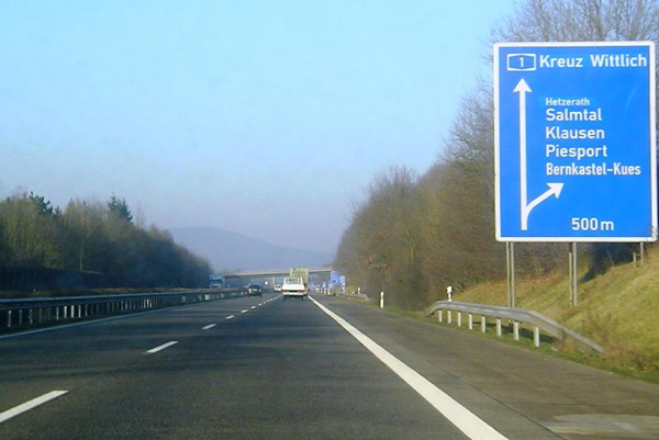 Dies ist die eben angekündigte Baustelle. Mittlerweile ist die Grünbrücke soweit fertig, dass keine Fahrstreifen der Autobahn darunter mehr geschlossen werden müssen. Außerdem steht hier der Vorwegweiser zum AK Wittlich. Geplant ist, die A 60 als B 50 in den Hunsrück (Richtung Flughafen Hahn) über die Mosel weiterzubauen.