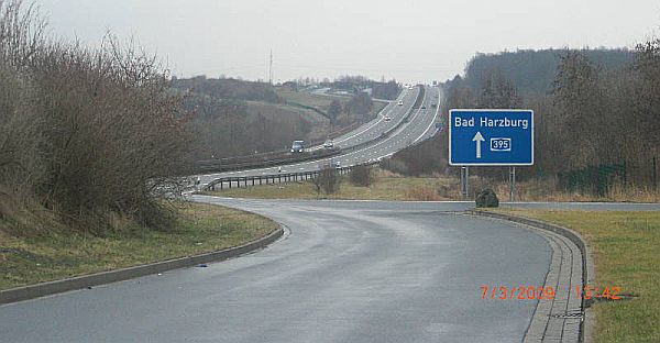 Ursprünglich führte die A 395 bis nach Bad Harzburg. Dieses Schild zeugt noch davon. Weiter vorn sind die Talbrücke Warnetal und der Parkplatz "Ziegenberg" der Gegenrichtung zu erkennen.