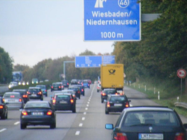 Nach Ende des Beschleunigungsstreifens des Wiesbadener Kreuzes kündigt sich vorzeitig die Raststätte Medenbach(-Ost) an.