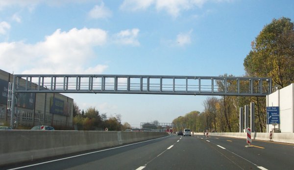 Kurz vor der AS Essen-Kray (27). Die hier befindliche Schilderbrücke, die in Richtung Duisburg die Ausfahrtziele, in Richtung Dortmund die nächste Anschlussstelle (Gelsenkirchen-Süd) anzeigt, wirkt aus dieser Perspektive etwas schräg montiert...
