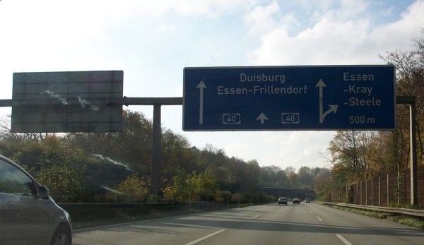Die langgezogene Ausfahrt Essen-Kray (27) mit markantem Ausfahrtpfeil.