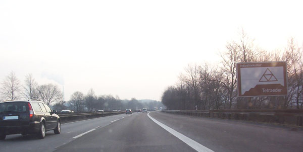 Hinweis auf den nahe gelegenen Tetraeder, ein vom Architekten Wolfgang Christ entworfener monumentaler Aussichtsturm in Form einer begehbaren Pyramide