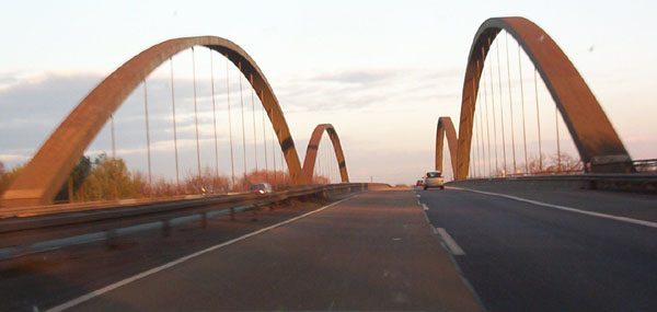 Der Doppelbogen der Rhein-Herne-Kanal-Brücke macht diese besonders markant