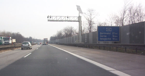 Bei dicht parallel zur Autobahn verlaufenden Straßen werden häufig Mautgalgen zusätzlich zu den großen Mautbrücken installiert