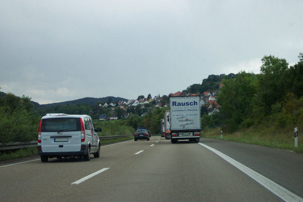 Der vorausfahrende LKW blockiert den malerischen Blick auf Burghausungen