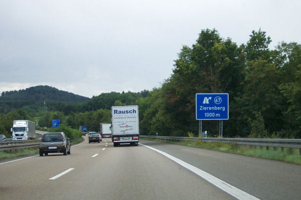 Einfahrt in das Kreuz Kassel-West (69) mit Wegweisung zum ansässigen VW-Werk.