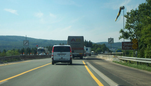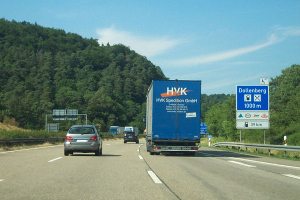 Ankündigung der Raststätte Dollenberg. Dahinter lugt hinter einem LKW eine Entfernungstafel hervor.