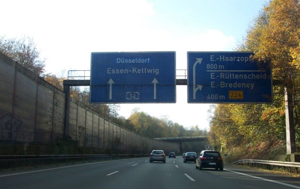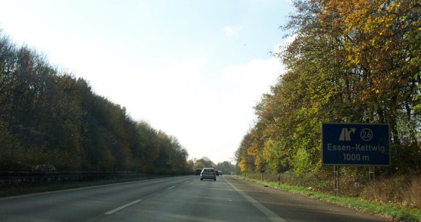 Kurz vor der AS Essen-Rüttenscheid. Die Vorwegweiser beziehen sich auch schon auf die dahinterliegende Ausfahrt.