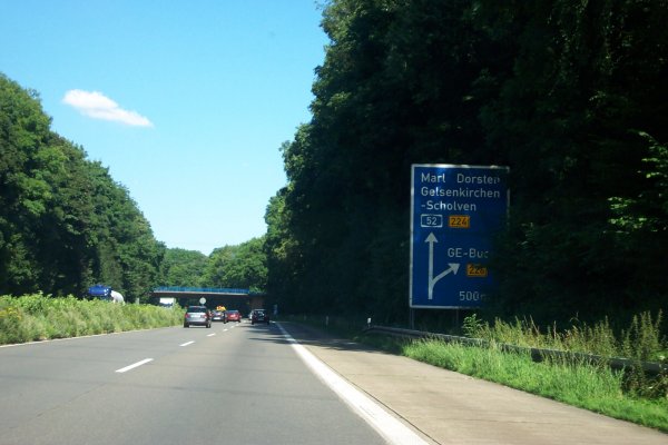 Gleich am Beginn der Autobahn an der Stadtgrenze Gladbeck/Gelsenkirchen werden die AS Gelsenkirchen-Buer-West (42) und Gelsenkirchen-Scholven (43) gleichzeitig angekündigt.