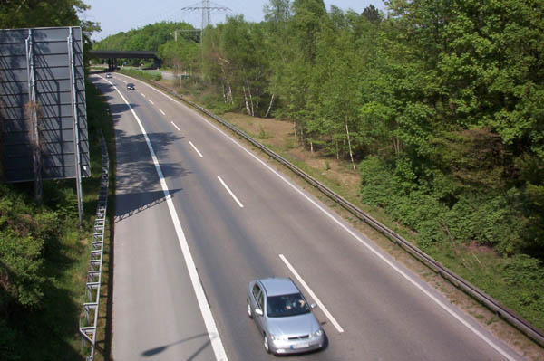 Am Vorwegweiser der AS Gelsenkirchen-Hassel. Ein sechsstreifiger Ausbau ist nicht vorgesehen. Vielmehr beruht der überbreite Seitenstreifen auf Vorleistungen zum Bau der Gabelung der ursprünglich geplanten A 41.