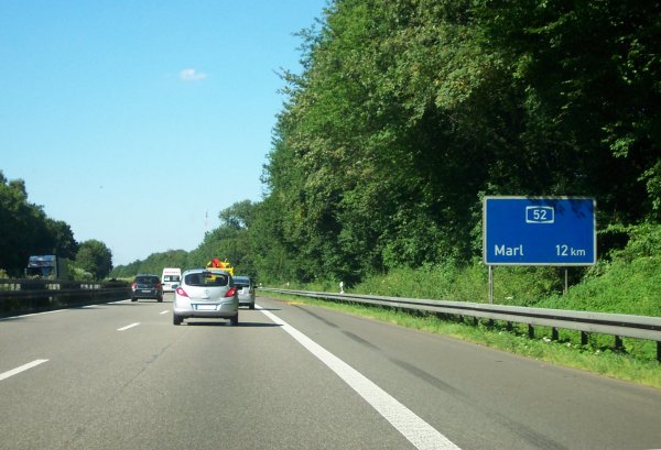 Vorwegweiser der Abzweigung Dorsten-Ost. Bei diesem Abzweig befanden sich bis Ende der 1980-er eine weitere Fahrbahntrennung und Vorleistungen für eine Gabelung. Hier sollte die L 612 von der A 41 abzweigen. In den frühen 1990-er Jahren wurde die gesamte L 612 zwischen Gelsenkirchen-Hassel und der A 43 im Kreuz Marl-Nord zur A 52 aufgestuft. weiter zu Teil 2 zurück zur Übersicht |