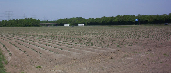 In der Fahrbahntrennung. Blick über die Richtungsfahrbahn Essen (mit Vorwegweiser der AS Gelsenkirchen-Scholven) nach Norden. Stellenweise sind überwachsene Vorleistungen der ursprünglich hier vorgesehenen Gabelung der A 41 zu erkennen. Weiter vorn stößt die Fahrbahn Richtung Haltern wieder zu. Weitere Fotos der Gabelung