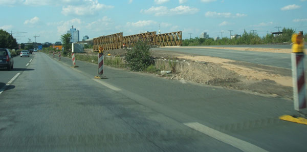 Die "Umleitung" scheint eine Brückenkonstruktion zu beinhalten. Hier wird man sich wohl unter der Behelfsstraße durchbuddeln und in die Autobahn eine Brücke einfügen.