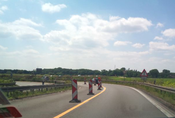 Im Kreuz auf der A59 / B8 Richtung Düsseldorf. Der Verkehr fließt vorerst noch auf der Gegenfahrbahn.