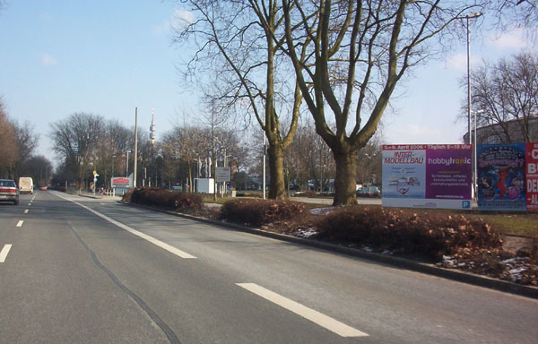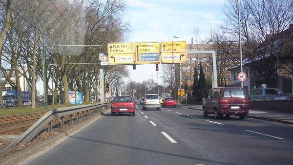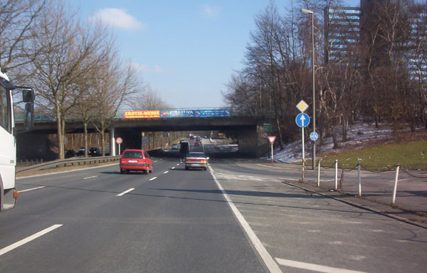 Abzweig zu den Westfalenhallen. Rechts im Bild ein Werbehinweis zur „Intermodellbau“ und zur Computermesse „Hobbytronic“, die seit einigen Jahren zeitgleich stattfinden, da sie ein vergleichbares Publikum anziehen und sich gegenseitig perfekt ergänzen.