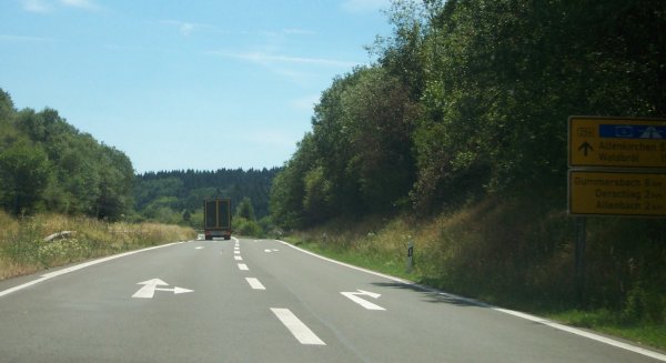 Scharfe Linkskurve hinter der Abzweigung. Bei dieser Kurve geht die Kreisstraße in die B 256a über (ohne, dass es angezeigt wird). Es gibt Pläne diese Straße von Süden kommend bis Kalsbach zu verlängern.
