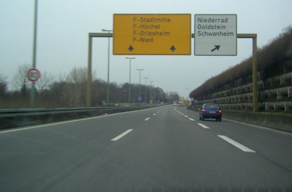 Abfahrt nach F-Niederrad, F-Goldstein und F-Schwanheim. Die B 40 (früher 40a) ist hier nicht mehr ausgeschildert.