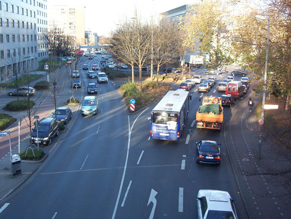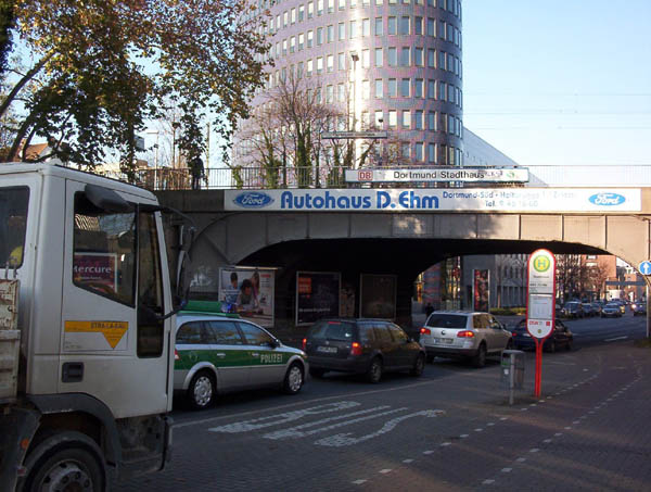 Blick von der Brücke der S-Bahnstation "Stadthaus" auf die Abzweigung der Märkischen Straße. Der blaue Bus der Casinolinie 444 nach Hohensyburg ist bei gutem Wetter trotz Zuschlag auch bei Ausflüglern beliebt.