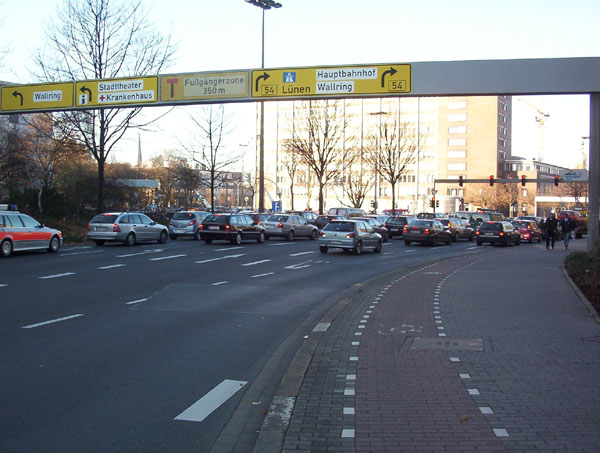 ...geht die B 54 auf den Wallring über. Dementsprechend ist es egal ob man links oder rechts abbiegt. Zumindest mit Ziel "Wallring", wie diese markante Schilderbrücke zeigt.