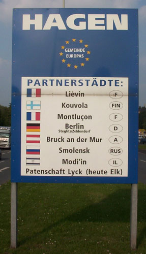 Auf der Vorderseite des Abschiedsgrußes werden die Partnerstädte der „Gemeinde Europas" Hagen aufgelistet