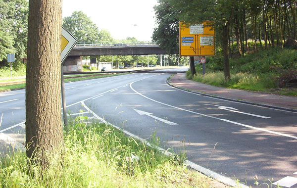 Blick schräg über die Fahrbahn auf die Brücke über die Straße „Harpener Feld"