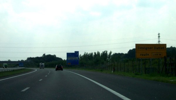 Hinweis auf das Designer Outlet, das über die nächste AS erreicht wird. Dahinter ein weiterer Vorwegweiser dieser AS.