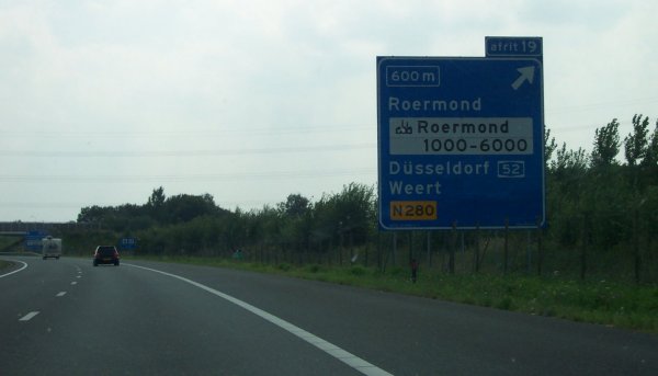 Ankündigung der AS Roermond mit Angabe des Zieles Düsseldorf, das über die N 280, die in Deutschland in die A 52 übergeht zu erreichen ist.