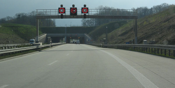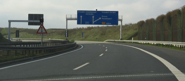 Bei Pirna (AS6). Die weißen Tafeln zeigen nur ein Tempolimit an.