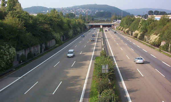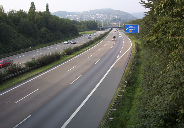 Vor der AS Hagen-West. Auf dem waldigen Hügel im Hintergrund ist die Stadt Herdecke zu sehen.