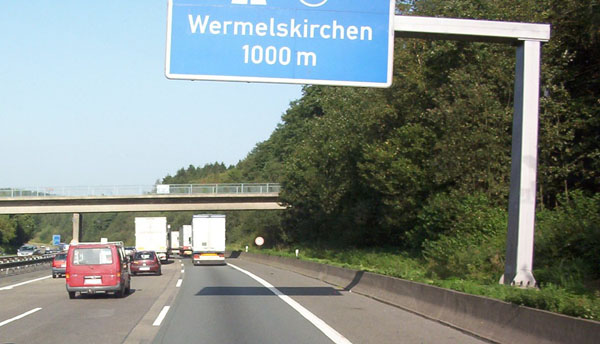 ...und die AS 96 Wermelskirchen werden kurz hintereinander angekündigt. Da sich gleich vor Wermelskirchen die Autobahn auf vier Fahrstreifen verengt, wird der Verkehr immer zäher.