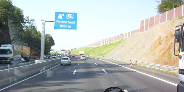 Da die AS Remscheid-Lennep zur Zeit der Aufnahme noch nicht eröffnet war, wird auf diesem Vorwegweiser als nächste AS noch "Wuppertal-Ronsdorf" provisorisch angezeigt. Bei genauem Hinsehen erkennt man, dass die neue Fahrbahn in Richtung Dortmund abgesenkt ist.
