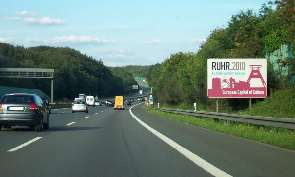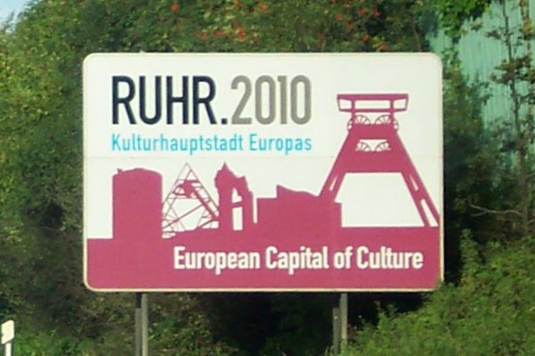 Wilkommen im Ruhrgebiet, das 2010 "Europäische Kulturhauptstadt" war, wie dieses Hinweisschild auch in englischer Sprache hervorhebt.