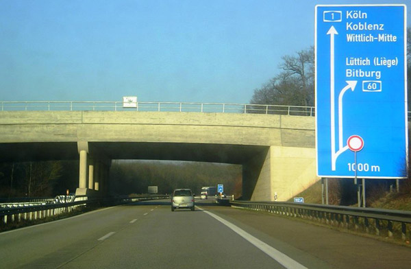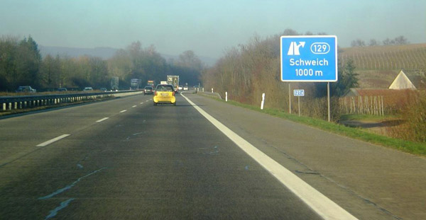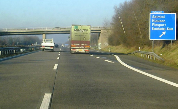 Dies ist die eben angekündigte Baustelle. Mittlerweile ist die Grünbrücke soweit fertig, dass keine Fahrstreifen der Autobahn darunter mehr geschlossen werden müssen. Außerdem steht hier der Vorwegweiser zum AK Wittlich. Geplant ist, die A 60 als B 50 in den Hunsrück (Richtung Flughafen Hahn) über die Mosel weiterzubauen.