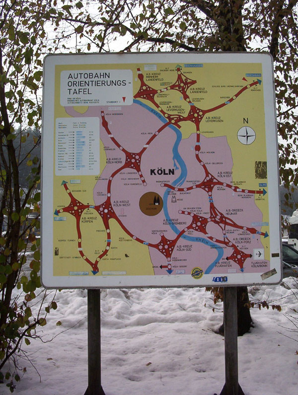 Autobahn-Orientierungstafel Großraum Köln an der Raststätte Remscheid. Interessant: Die B 55a Zoobrücke - Kreuz Köln-Ost ist als Autobahn eingetragen.