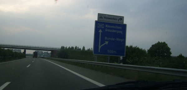 Die Bundesgrenze Bunde-West/Nieuweschans. Hier geht die A 280 in die niederländische A 7 über, die über Groningen und den Abschlussdeich des IJsselmeeres nach Amsterdam führt. zurück zur Übersicht |