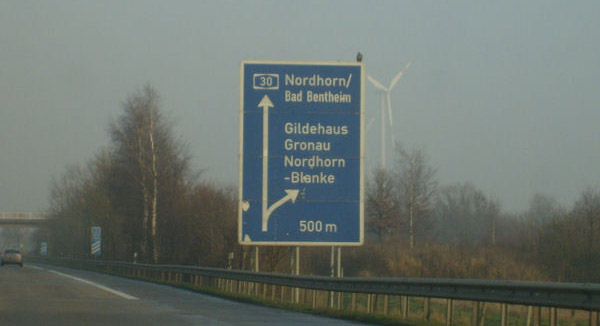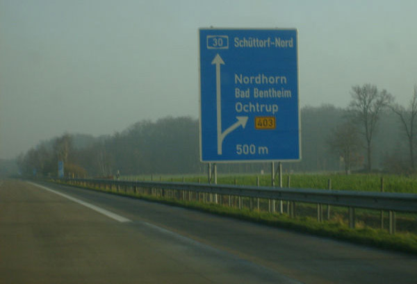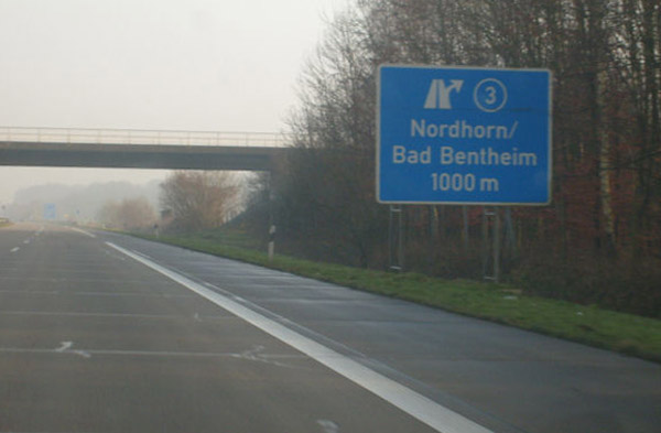 Fahrtrichtung Ost © Marcel van der Broek, 24.12.2007 Bundesgrenze Bad Bentheim/De Lutte Information über Tempolimits im Deutschland. Dahinter kündigt sich die AS 2 Gildehaus an. Ausfahrt 2: Gildehaus Hinweis für die LKW-Maut auf deutschen Autobahnen ab 12 t. Entfernungstafel hinter Gildehaus Mautportal Hinweistafel "Burg Bentheim" AS 3: Nordhorn / Bad Bentheim Entfernungstafel hinter Bad Bentheim Doppelankündigung der AS 4 Schüttorf-Nord & AS 5 Kreuz Schüttorf Verkehrszeichen im Nebel: Vorwegweiser für AS 4 & 5 Kreuz Schüttorf Die beiden Anschlussstellen werden über eine gemeinsame Verteilerfahrbahn bedient Auf der Verteilerfahrbahn im Kreuz zurück zur Übersicht |