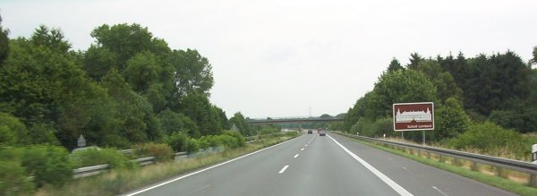 Vorwegweiser der AS Lembeck. Hinter den Bäumen gibt's den Big Mac. Der Autohof ist zwar gestorben, die Fastfoodkette mit dem berühmten "M" hat sich dennoch hier niedergelassen.