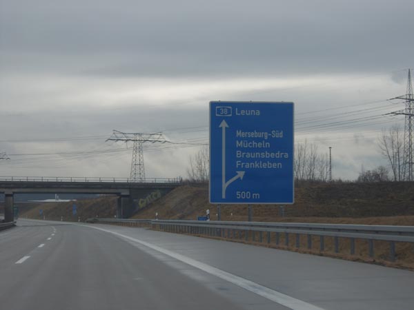 Ausfahrt Merseburg-Nord (AS 24). Die hier kreuzende Straße ist - noch - die Hauptverbindung zwischen Merseburg und Querfurt.