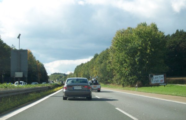 Ein Plakat der ermahnt zu umsichtiger Fahrweise - hier mit der Aufschrift "Lass dir Zeit". Plakate wie diese sind an der A 3 in Franken öfter zu finden.
