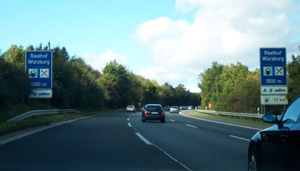 Ankündigung der Raststätte Würzburg am Fahrbahnrand und auf dem Mittelstreifen