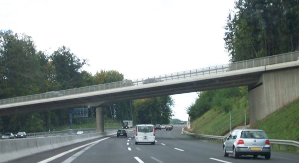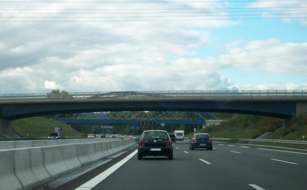 Wiederbeginn der sechsspurig ausgebauten Autobahn und Beginn der Verschwenkung. Im Zuge des Ausbaues wurde die Trasse ein Stückchen nach Süden verlagert. Man erkennt noch die Kurve der alten Trasse.
