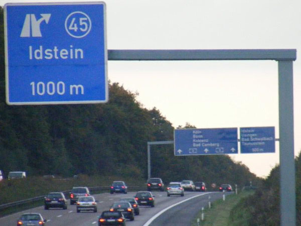 Nach Ende des Beschleunigungsstreifens des Wiesbadener Kreuzes kündigt sich vorzeitig die Raststätte Medenbach(-Ost) an.