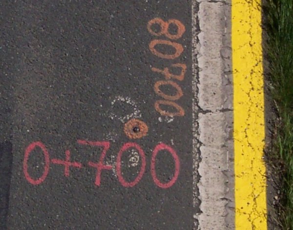 31.07.2008 Richtung Dortmund befindet sich dieser Messpunkt auf der Fahrbahn. Die Zahlenfolge "0+700" ist eine km-Angabe und entspricht der Betriebskilometrierung (km 0,7).