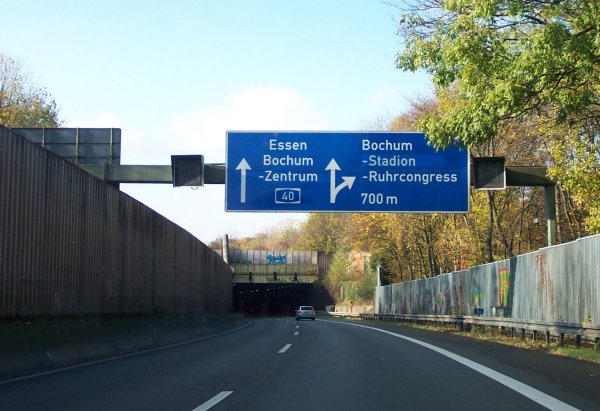 Vorwegweiser der AS Bochum-Stadion und Portal des kurzen Tunnel Grumme.