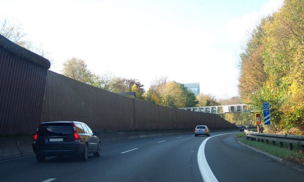 Kurz hinterm Westportal des Tunnels. Über die AS Bochum-Stadion erreicht man auch die "Starlight-Halle", die eigens für die Aufführung des Musicals "Starlight-Express", das weltweit meistbesuchte Musical an einem festen Standort, gebaut wurde.