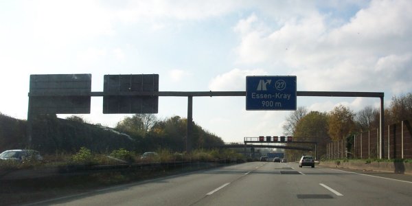 Die langgezogene Ausfahrt Essen-Kray (27) mit markantem Ausfahrtpfeil.