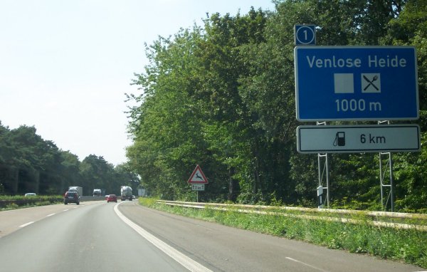 Der Parkplatz "Venlose Heide" kündigt sich an. Zudem ist auf einem Zusatzschild die AS-Nr. 1 angegeben.
