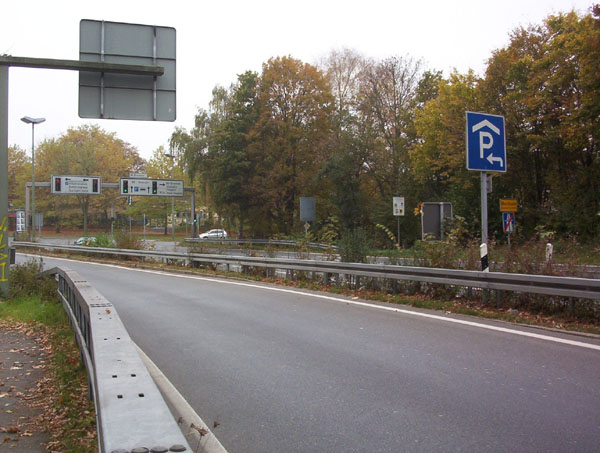 Gleich beim Zusammenlauf der Fahrbahnen aus beiden Richtungen wird der Ortseingang Bochum erreicht. Man wird auf ein Parkhaus aufmerksam gemacht.