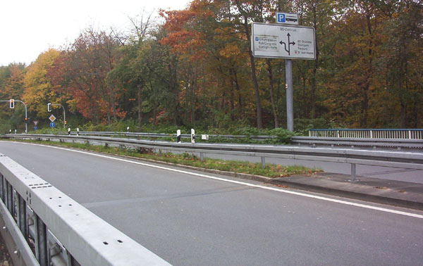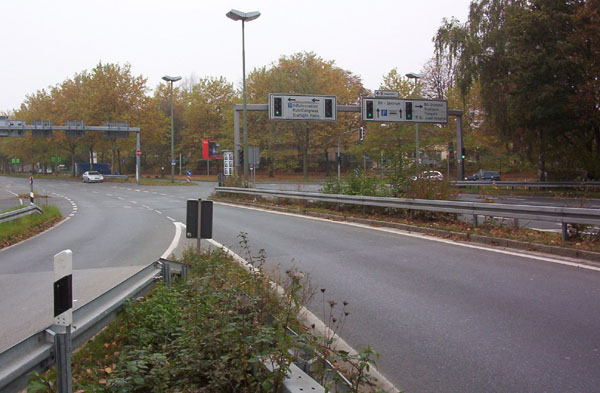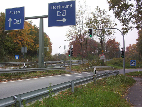 Zurück zur Kreuzung Gudrunstraße. Kaum ist die Kreuzung passiert, müssen sich die Autofahrer schon überlegt haben, in welche Richtung sie auf die A 40 auffahren wollen, denn die Rampe nach Dortmund zweigt direkt nach der Kreuzung ab! zurück zur Übersicht |