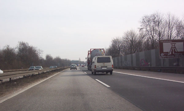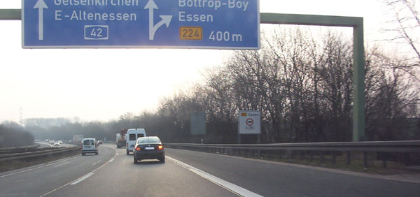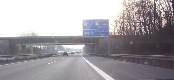 Kurz hinter dem Kreuz Essen-Nord folgt gleich die AS 14 Essen-Altenessen. Die alten, innen beleuchteten Wegweiser wurden inzwischen durch übliche, reflektierende Exemplare ersetzt.